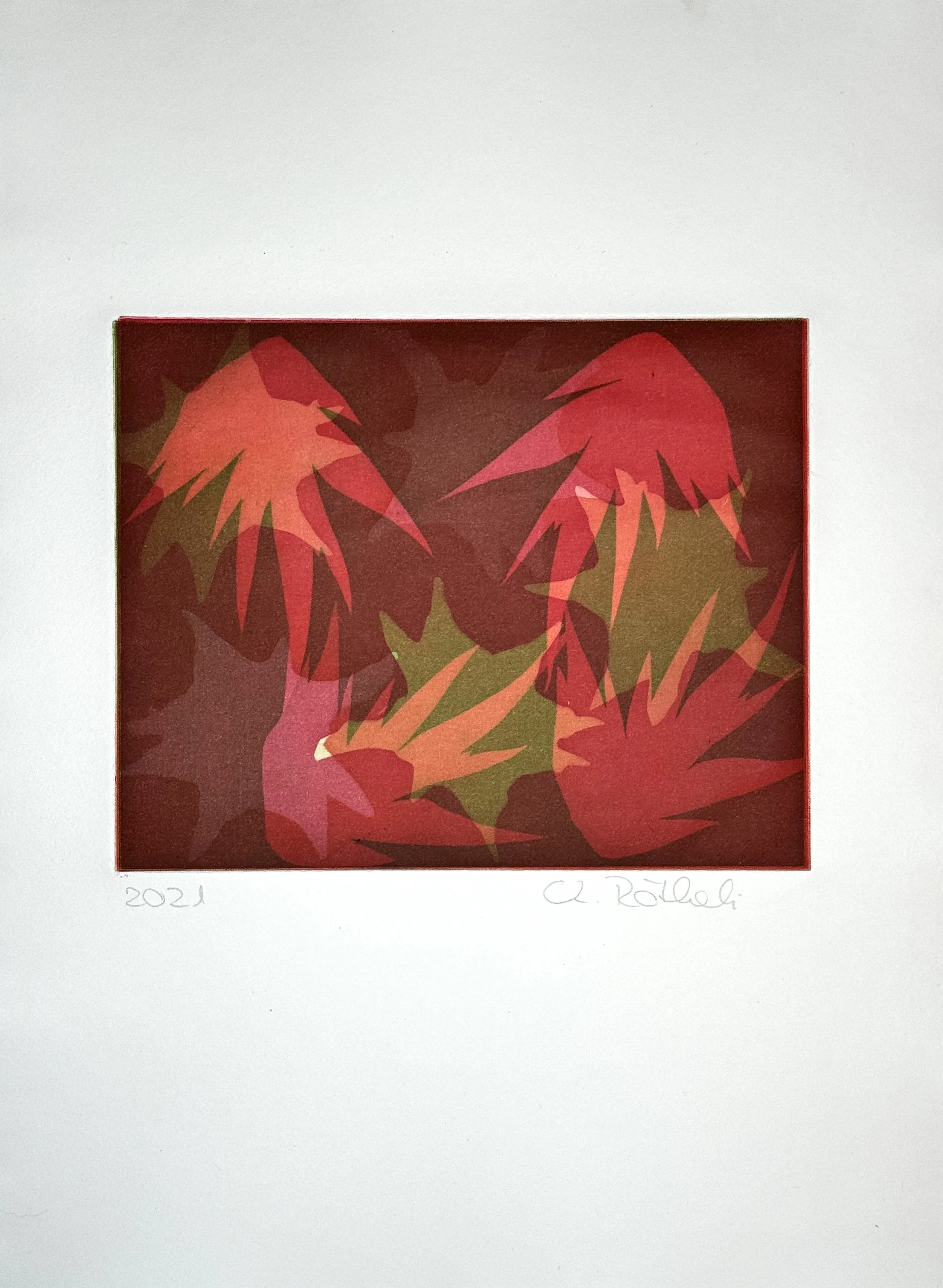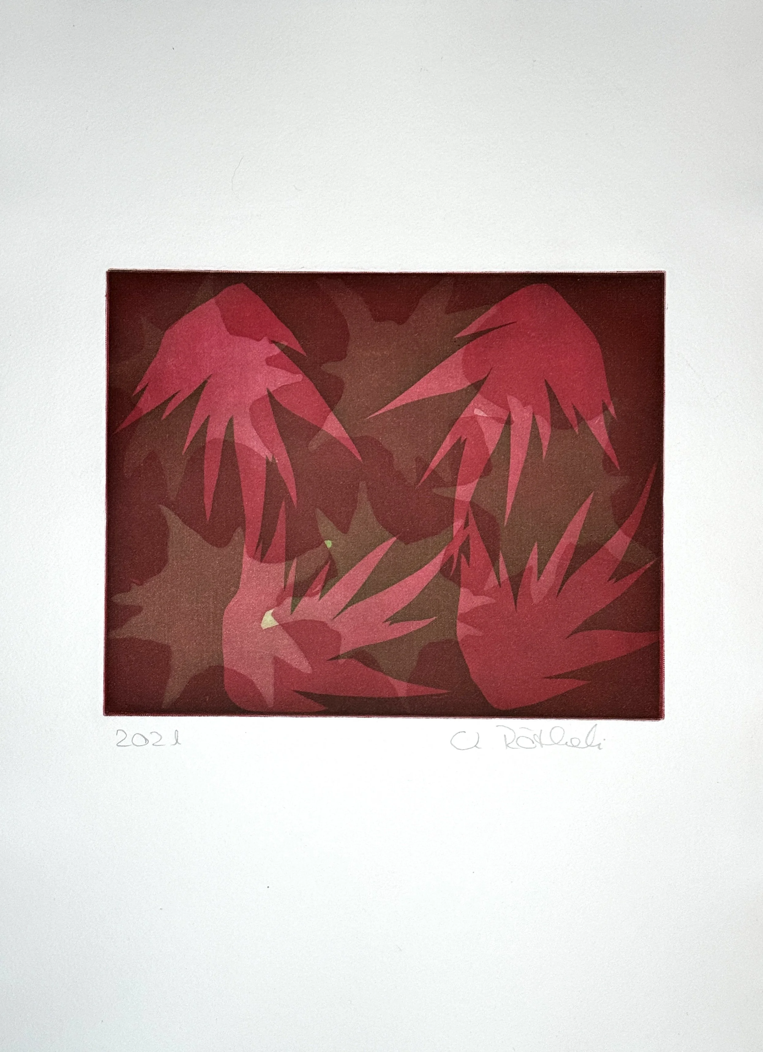 Blumen in meinem Garten II, 2021, Serie rot-grünDreiplattendruck, AquatintaPlattengrösse 15,8 x 19,8 cm Im Vollbildmodus anzeigen Im Vollbildmodus anzeigen Im Vollbildmodus anzeigen